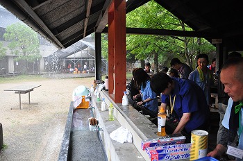 | 分担して材料を切ったり、かまどの準備をしますが、途中突然の夕立が来ました。 |